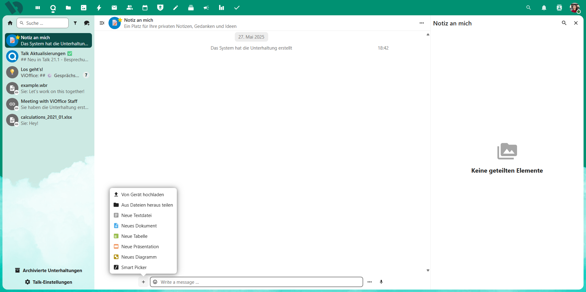 Das Anklicken des "Plus" () unten links neben dem Textfeld ermöglicht das Teilen von Dokumenten aus der ViOffice Cloud oder aus dem lokalen Speicher direkt über den Chat.