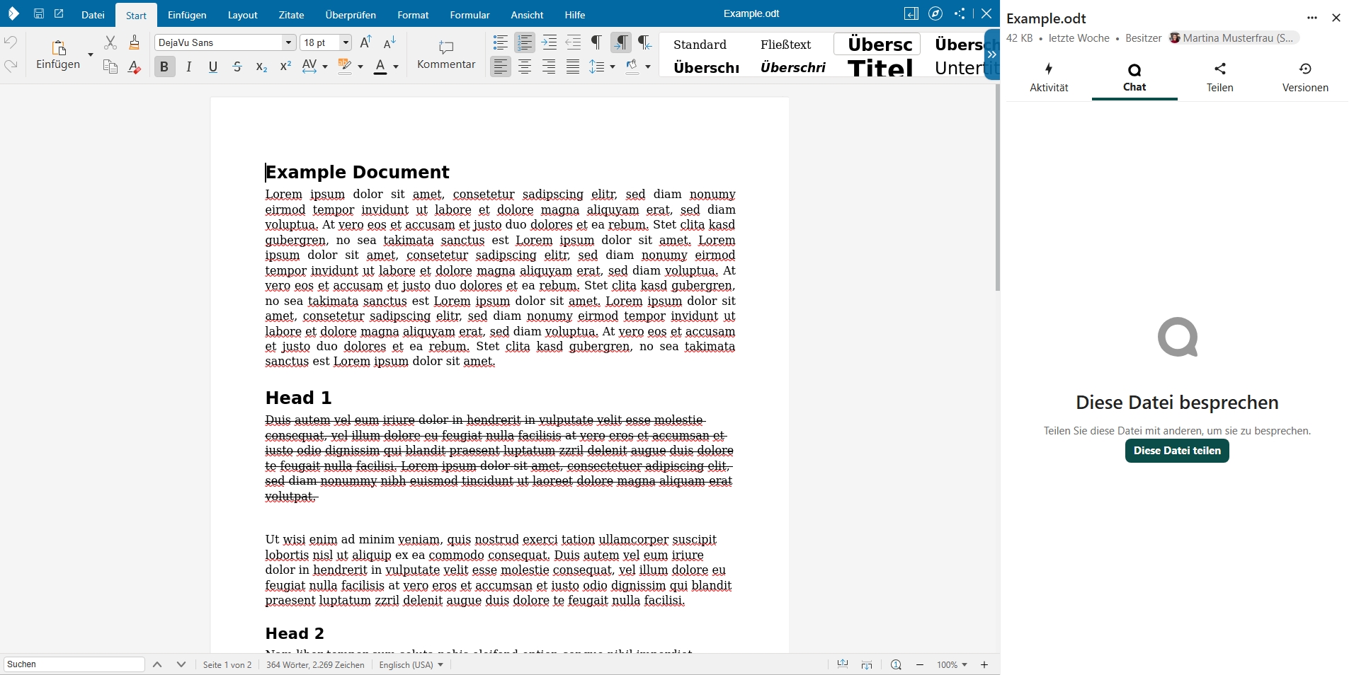 Wie bereits zuvor kurz beschrieben, ist ViOffice Talk verknüpft mit ViOffice Sheets. Sofern Sie ein Text-, Tabellen oder Präsentationsdokument in ViOffice Sheets öffnen, wird Ihnen die Möglichkeit gegeben über das "Teilen" Symbol () am rechten oberen Bildschirmrand die "Details" aufzurufen. Dadurch öffnet sich eine Seitenleiste, die ein "Chat"-Menü beinhaltet. Dadurch kann bequem ein Chatraum in ViOffice Talk geöffnet werden, um die Zusammenarbeit an einem Dokument zu erleichtern.